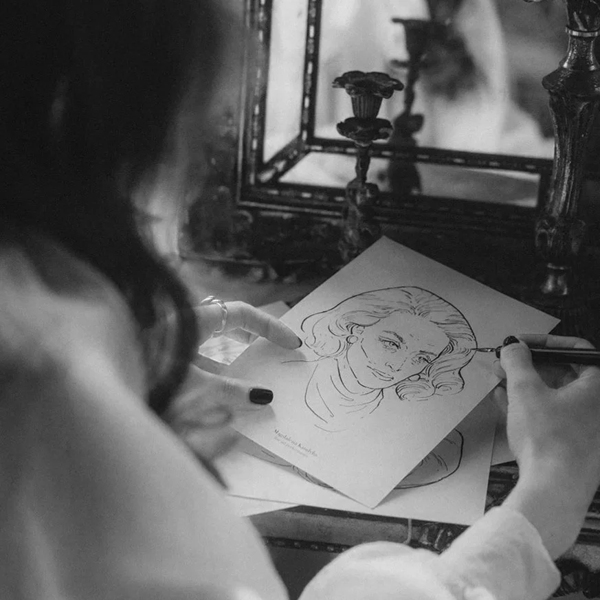W czasie wydarzenia tworzę ekspresyjne ilustracje gości w duchu klasycznej ilustracji mody. Każdy szkic powstaje na oczach gości, w około 12–15 minut.